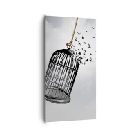 Cuadro sobre vidrio - Impresiones sobre Vidrio - Pájaros volando desde una jaula contra el cielo. - 80x120cm - Fe... Esperanza... ¡Libertad! - Decoración de pared moderna para salón y dormitorio ARTTOR