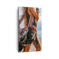 Cuadro sobre lienzo - Impresión de Imagen - Una mujer con estilo boho con detalles de plumas y joyas. - 160x50cm - La chamana - Decoración de pared moderna para salón y dormitorio ARTTOR