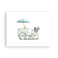Póster - Una bicicleta con helado y flores bajo una sombrilla en delicados colores pastel. - 100x70cm - Dulce recuerdo del verano - Decoración de pared moderna para salón y dormitorio ARTTOR